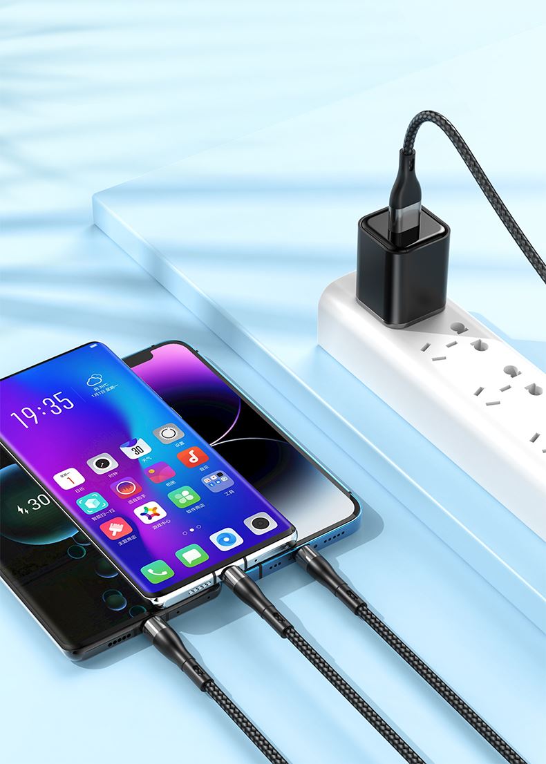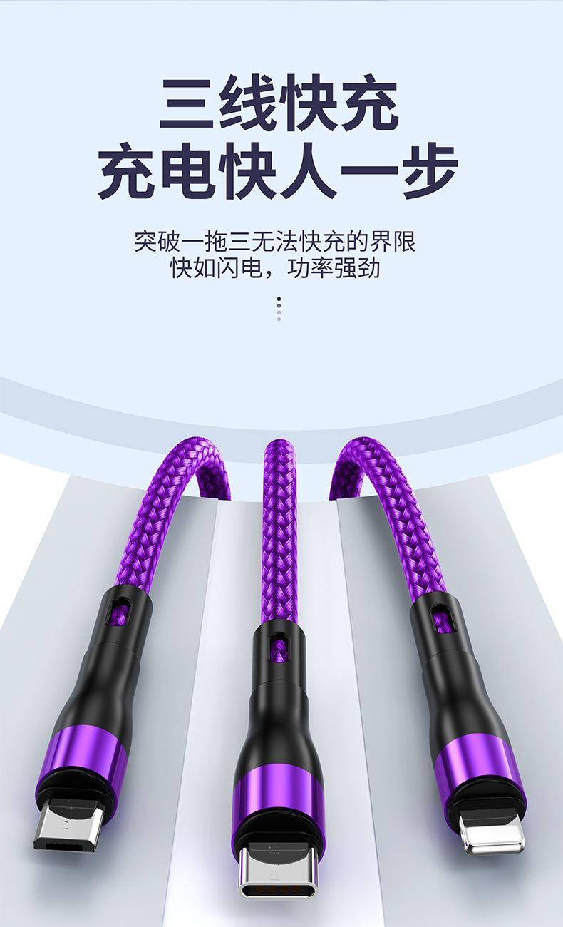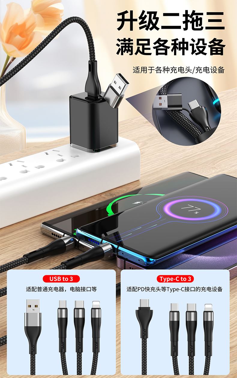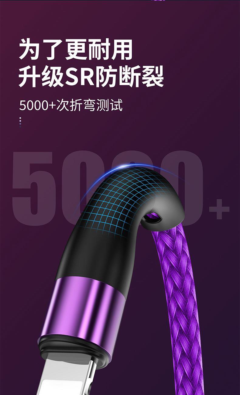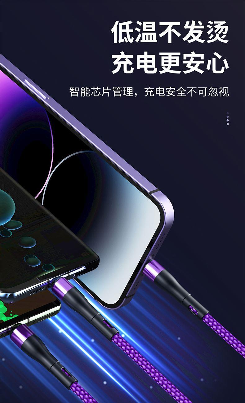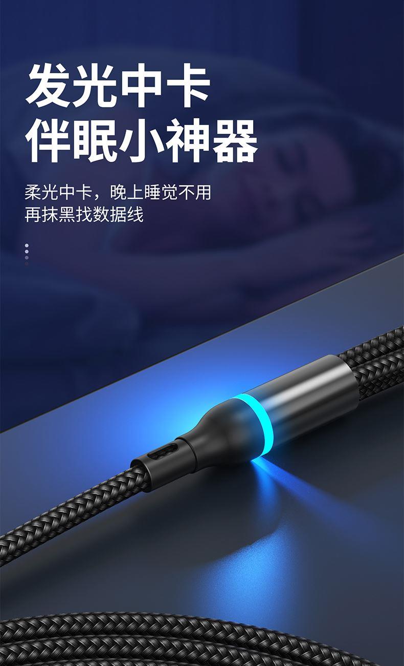S6B二拖三66W快充柔光燈數(shù)據(jù)線 顏色:綠色 紫色 黑色 材質(zhì):編織線 尺寸:1.2M 包裝:彩盒包裝 【功能特點】: A/C口二拖三設(shè)計,兼容蘋果15系列 66W超級快充,充電更快 小柔光燈設(shè)計,黑夜不黑暗 加粗編織線,一體成型充電頭 1.2米長度設(shè)計,使用方便 編織線耐磨耐用,不易折斷